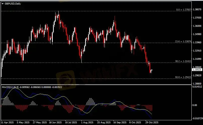 日线图显示英镑兑美元低位反弹,当前仍承压于1.3140阻力。从MACD来看,快慢线向下运行,红色动能柱则温和收缩。汇价走势基本和动能柱的变化一致。