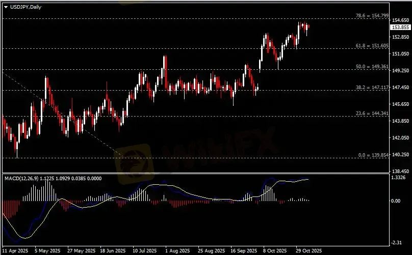 日线图显示美元兑日元反弹上涨,当前仍承压于154.80阻力。从MACD来看,快慢线欲形成死叉,白色动能柱温和收缩。汇价走势和动能柱的变化呈分歧。