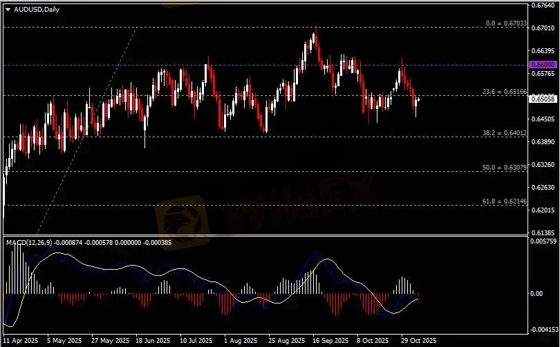 日线图显示澳元兑美元反弹上涨,当前逼近0.6520阻力。从MACD来看,快慢线死叉依旧,红色动能柱温和增量。汇价走势和动能柱的变化呈分歧。