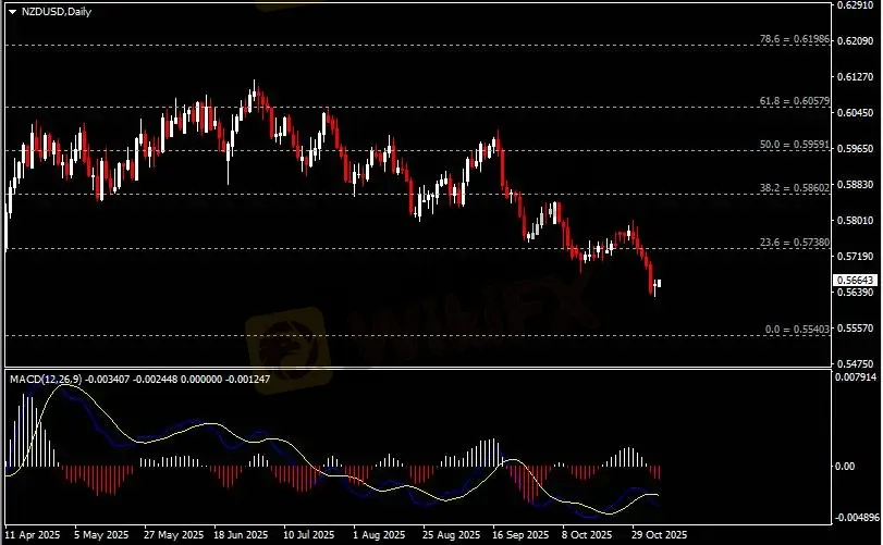 日线图显示纽元兑美元跌势暂缓,当前仍承压于0.5740阻力。从MACD来看,快慢线拐向下行,红色动能柱温和放量。汇价走势和动能柱的变化呈分歧。