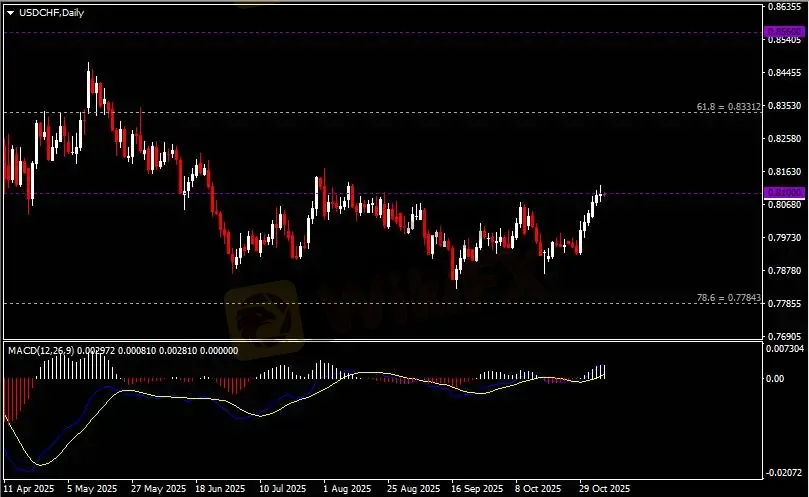 日线图显示美元兑瑞郎震荡上涨,当前测试0.81关键阻力。从MACD来看,快慢线向上运行,白色动能柱温和放量。汇价走势基本和动能柱的变化一致。