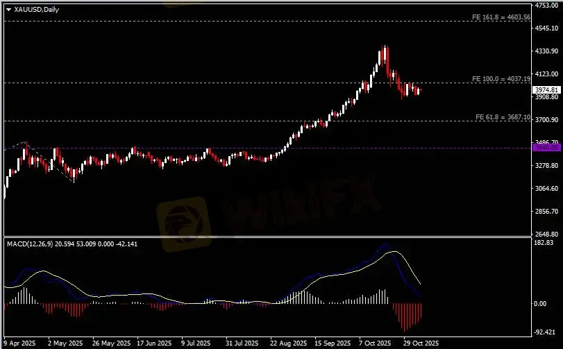 日线图显示金价温和反弹,当前仍承压于4040阻力。从MACD来看,快慢线向下运行,红色动能柱则温和收缩。金价走势基本和动能柱的变化一致。
