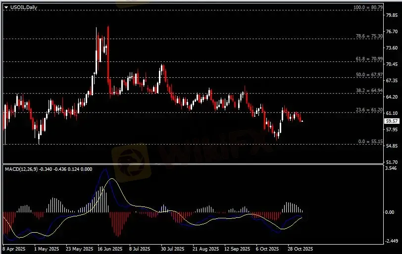 日线图显示油价回调下挫,当前承压于61.20阻力。从MACD来看,快慢线逐渐收窄,白色动能柱温和收缩。油价走势基本和动能柱的变化一致。