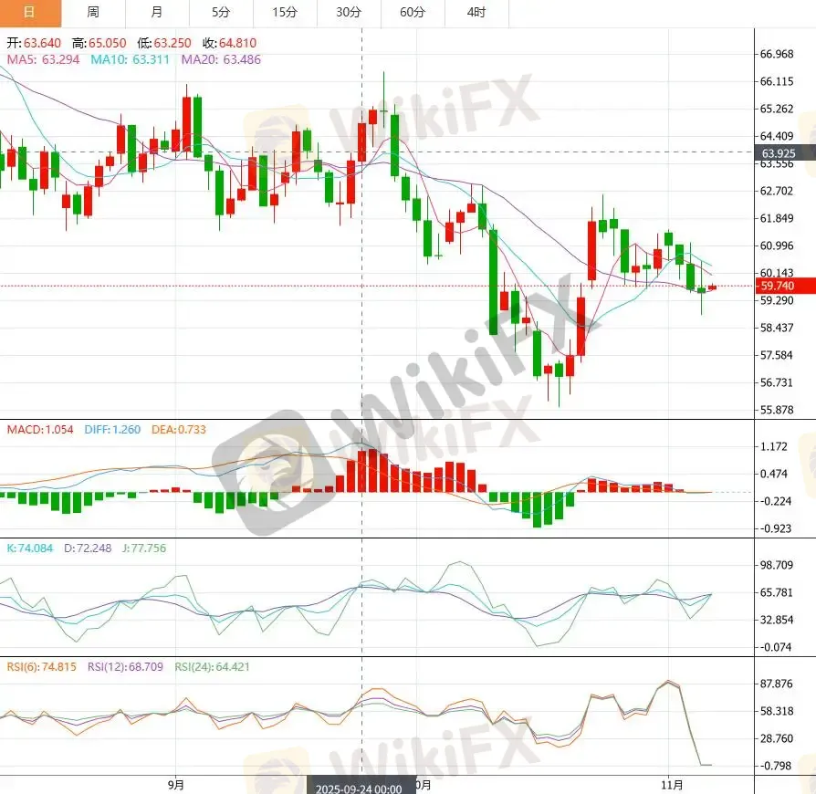 原油价格回归59.64-61.94美元震荡区间,缓解短期看空压力。日线图震荡指标仍处负值区域,显示看空压力未消:若跌破59.00美元心理关口,可能下探10月20日55.96美元低点,需持续回升至周四高点60.51美元上方,方有望突破61.94美元区间上边界。