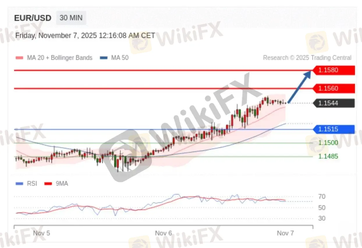 在 1.1515 之上,看涨,目标价位为 1.1560 ,然后为 1.1580 。
