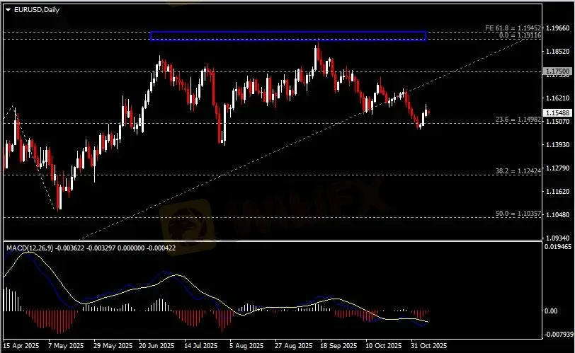 日线图显示美元兑日元反弹上涨,当前承压于154.80阻力。从MACD来看,快慢线死叉依旧,红色动能柱温和增量。汇价走势和动能柱的变化呈分歧。