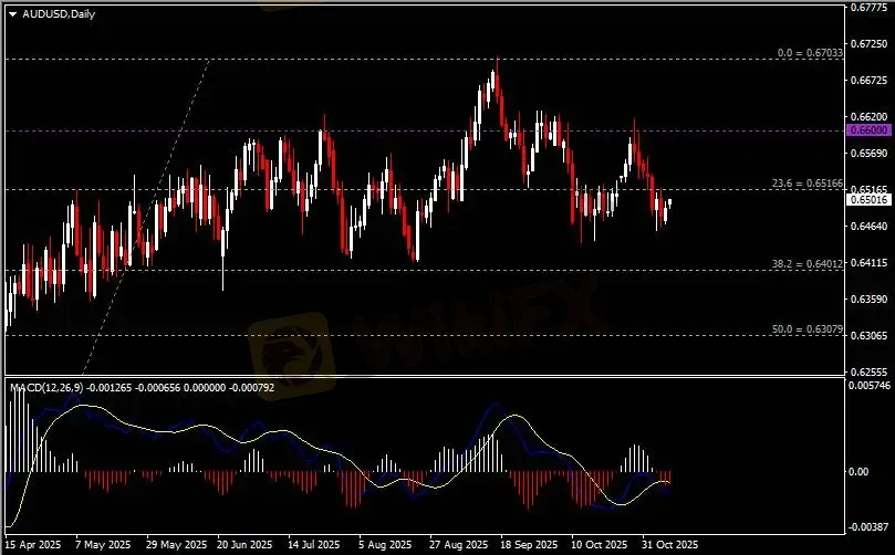 日线图显示澳元兑美元反弹上行,当前仍承压于0.6520阻力。从MACD来看,快慢线拐向下行,红色动能柱则温和收缩。汇价走势基本和动能柱的变化一致。