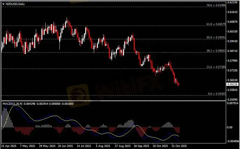 日线图显示纽元兑美元震荡走弱,当前承压于0.5740阻力。从MACD来看,快慢线向下扩张,红色动能柱温和放量。汇价走势基本和动能柱的变化一致。