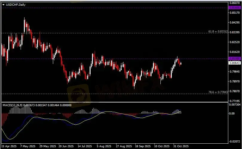 日线图显示美元兑瑞郎高位回调,当前承压于0.81关键阻力。从MACD来看,快慢线呈拐向,白色动能柱温和收缩。汇价走势基本和动能柱的变化一致。