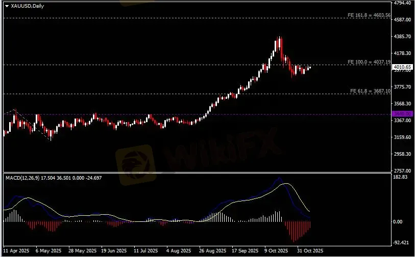 日线图显示金价震荡上行,当前逼近4040阻力。从MACD来看,快慢线略呈拐向,红色动能柱温和收缩。金价走势基本和动能柱的变化一致。