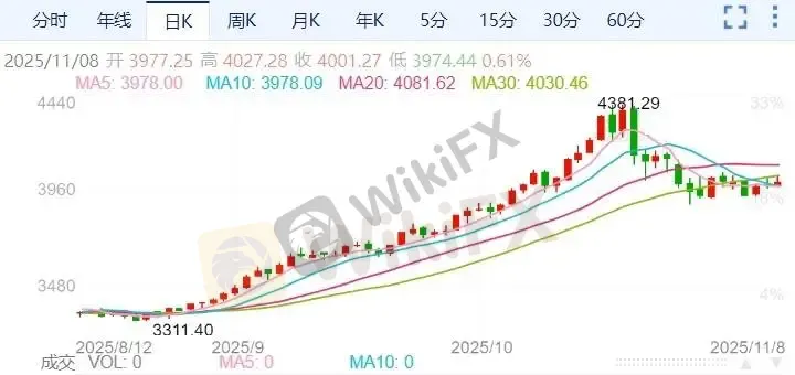 11月7日,现货黄金小幅走强,维持在3900-4050美元的熟悉区间内。美国政府长期停摆及全球市场的谨慎情绪,支撑避险买盘保持稳定。黄金持续在窄幅区间内交易,近两周价格走势基本局限于3900-4050美元之间。4小时图上,区间震荡格局主导市场,多次尝试突破4020-4050美元区间均遭遇强劲阻力,而3900美元区域持续提供坚实支撑。
