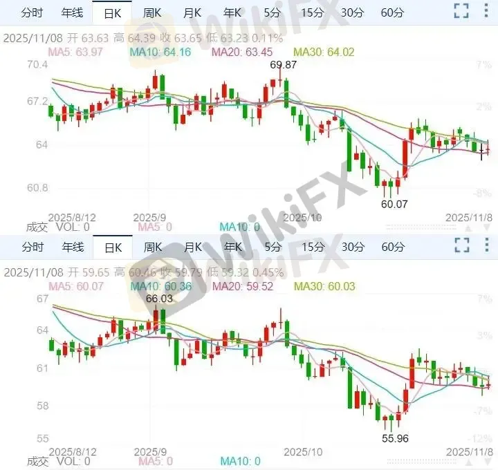 本周原油市场整体呈现震荡下行走势,最终布伦特结算63.63美元/桶,周涨25美分但周线下跌约2%;W美原油报59.75美元/桶,周涨32美分,周线同样跌约2%,连续第二周收跌。展望下周,美国停摆影响若持续发酵,叠加潜在俄供应中断,油价或现宽幅震荡。但基本面偏空,投资者需警惕布油跌破63美元引发连锁抛售。分析师预警,原油市场或已进入“冬眠”警戒期,多头梦碎,空头盛宴或刚拉开序幕!