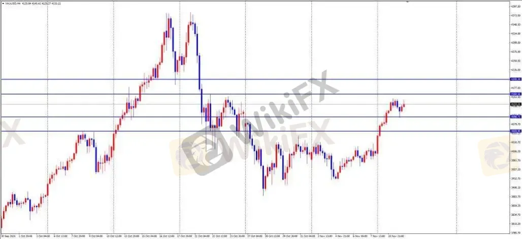 摘要:XAU/USD 昨日回顾与 ETO Markets 观点周二黄金在亚盘延续多头走势,创出近期新高至 4150 附近;欧盘于高位震荡整理,美盘自高点快速回落至 4096 附近后反弹,日线收带上下影线的小阳线。市场对疲软经济数据的预期增强了美联储 12 月降息的概率,为金价提供一定支撑。今日早盘再次上探昨日高点后回落,4 小时周期显示动能减弱,行情可能进一步回调。ETO Markets 建议关注下方