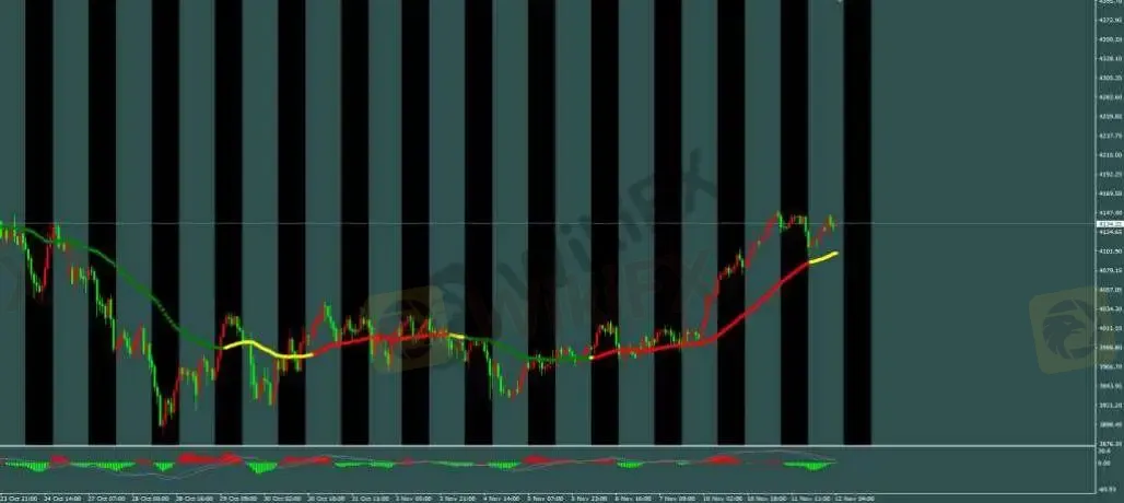 周二黄金在亚盘延续多头走势,创出近期新高至 4150 附近;欧盘于高位震荡整理,美盘自高点快速回落至 4096 附近后反弹,日线收带上下影线的小阳线。市场对疲软经济数据的预期增强了美联储 12 月降息的概率,为金价提供一定支撑。今日早盘再次上探昨日高点后回落,4 小时周期显示动能减弱,行情可能进一步回调。ETO Markets 建议关注下方 4100 及 4090 附近支撑,日内策略以回调后逢低做多为主。