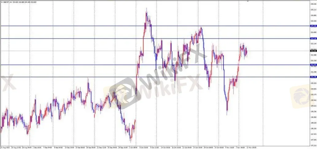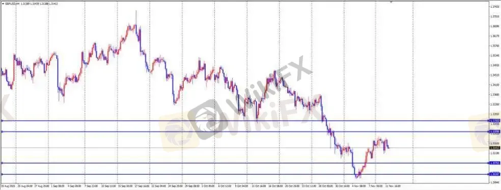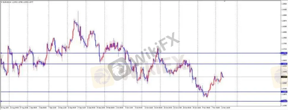 周二欧美小幅震荡后于美盘上涨至 1.1606 附近,随后回落至 1.158 整理,日线收带上影线的阳线。德国 ZEW 经济景气指数不及预期,但市场对欧元区整体景气度改善仍有期待。美国众议院结束休会,市场预计政府停摆将告一段落。ETO Markets 认为,欧美短期或维持震荡,建议关注 1.162 – 1.163 附近阻力。