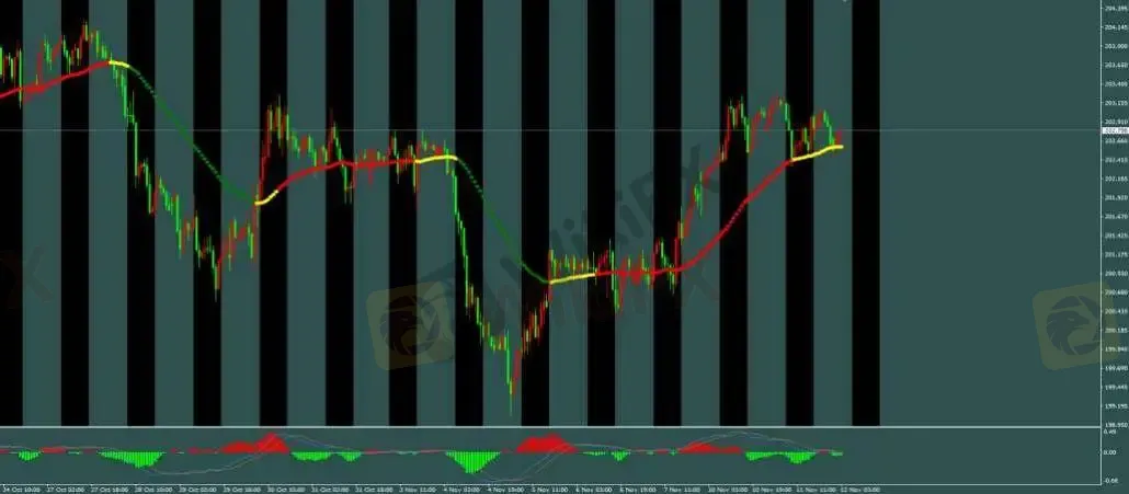 三色线颜色由红转黄,H1 标准多单已于 200.9 入场并盈利 70 点出场。日内建议结合 M5 基础运用模型操作。