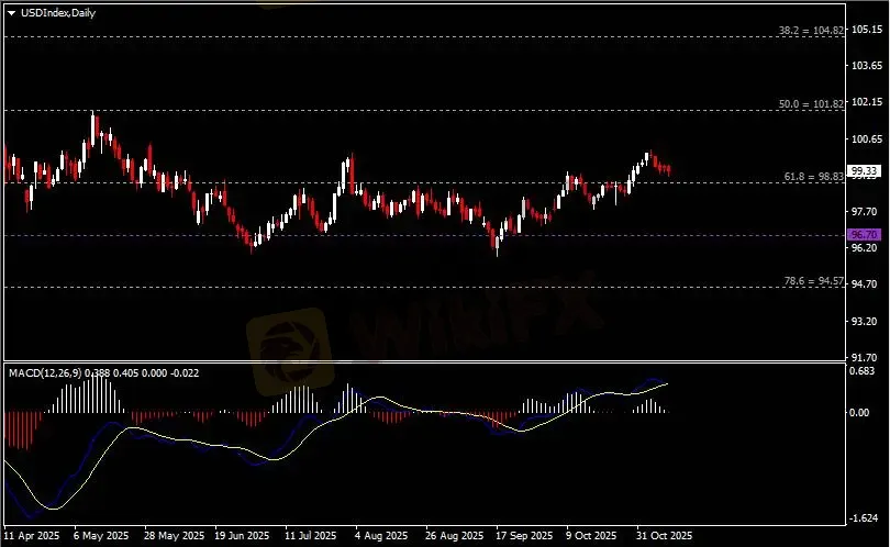日线图显示美元指数回调下挫,当前仍收于98.80支撑。从MACD来看,快慢线形成死叉,白色动能柱收缩殆尽。指数走势基本和动能柱的变化一致。