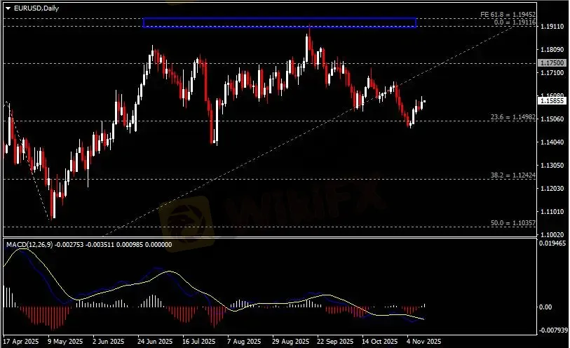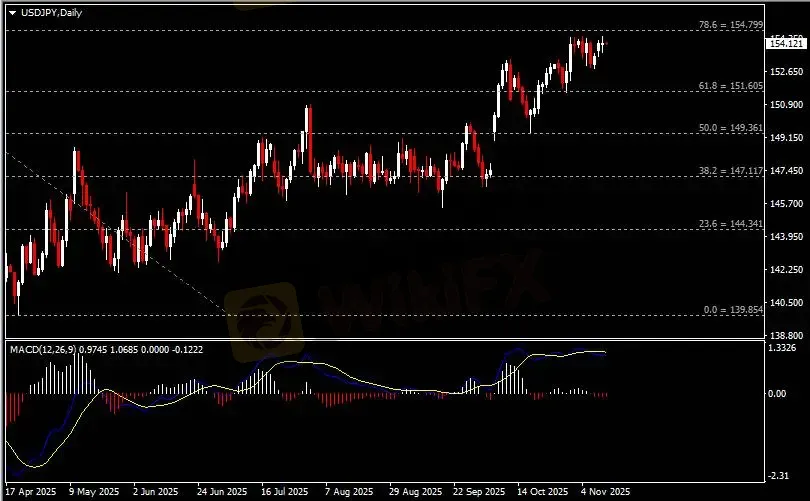 日线图显示美元兑日元于高位区间震荡,当前仍承压于154.80阻力。从MACD来看,快慢线呈平行,红色动能柱显示汇价动能有限。汇价走势基本和动能柱的变化一致。