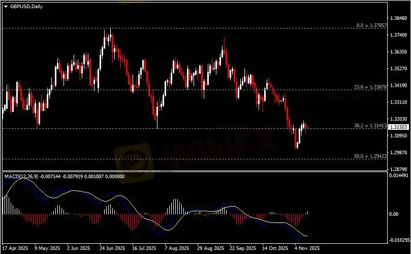 日线图显示英镑兑美元回调下挫,当前测试1.3140支撑。从MACD来看,快慢线金叉依旧,白色动能柱温和增量。汇价走势和动能柱的变化呈分歧。