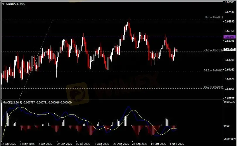 日线图显示澳元兑美元小幅收跌于0.6520支撑。从MACD来看,快慢线欲形成金叉,红色动能柱收缩殆尽。汇价走势和动能柱的变化稍显分歧。