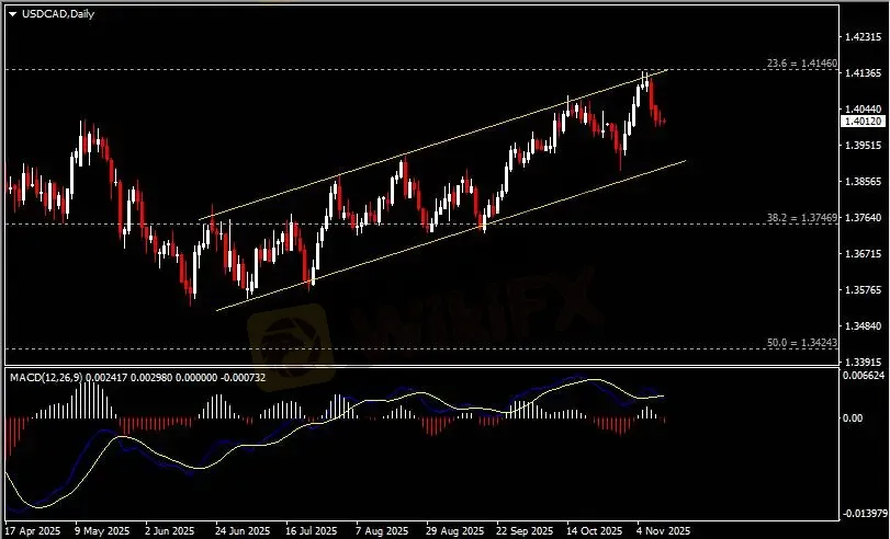 日线图显示美元兑加元震荡走弱,当前承压于上行通道顶线。从MACD来看,快慢线形成死叉,白色动能柱收缩殆尽。汇价走势基本和动能柱的变化一致。