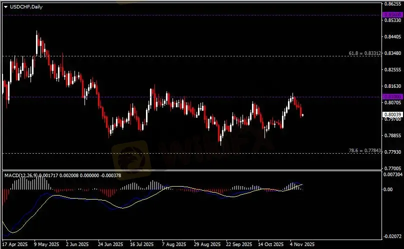 日线图显示美元兑瑞郎震荡下挫,当前承压于0.81关键阻力。从MACD来看,快慢线形成死叉,白色动能柱收缩殆尽。汇价走势基本和动能柱的变化一致。