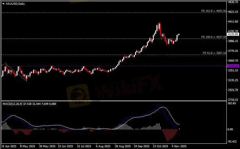 日线图显示金价反弹上行,当前收于4040支撑。从MACD来看,快慢线形成金叉,红色动能柱收缩殆尽。金价走势基本和动能柱的变化一致。