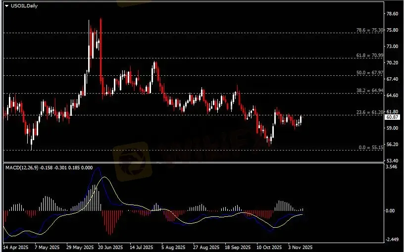 日线图显示油价震荡上行,当前测试61.20阻力。从MACD来看,快慢线拐向上行,白色动能柱温和增量。油价走势基本和动能柱的变化一致。