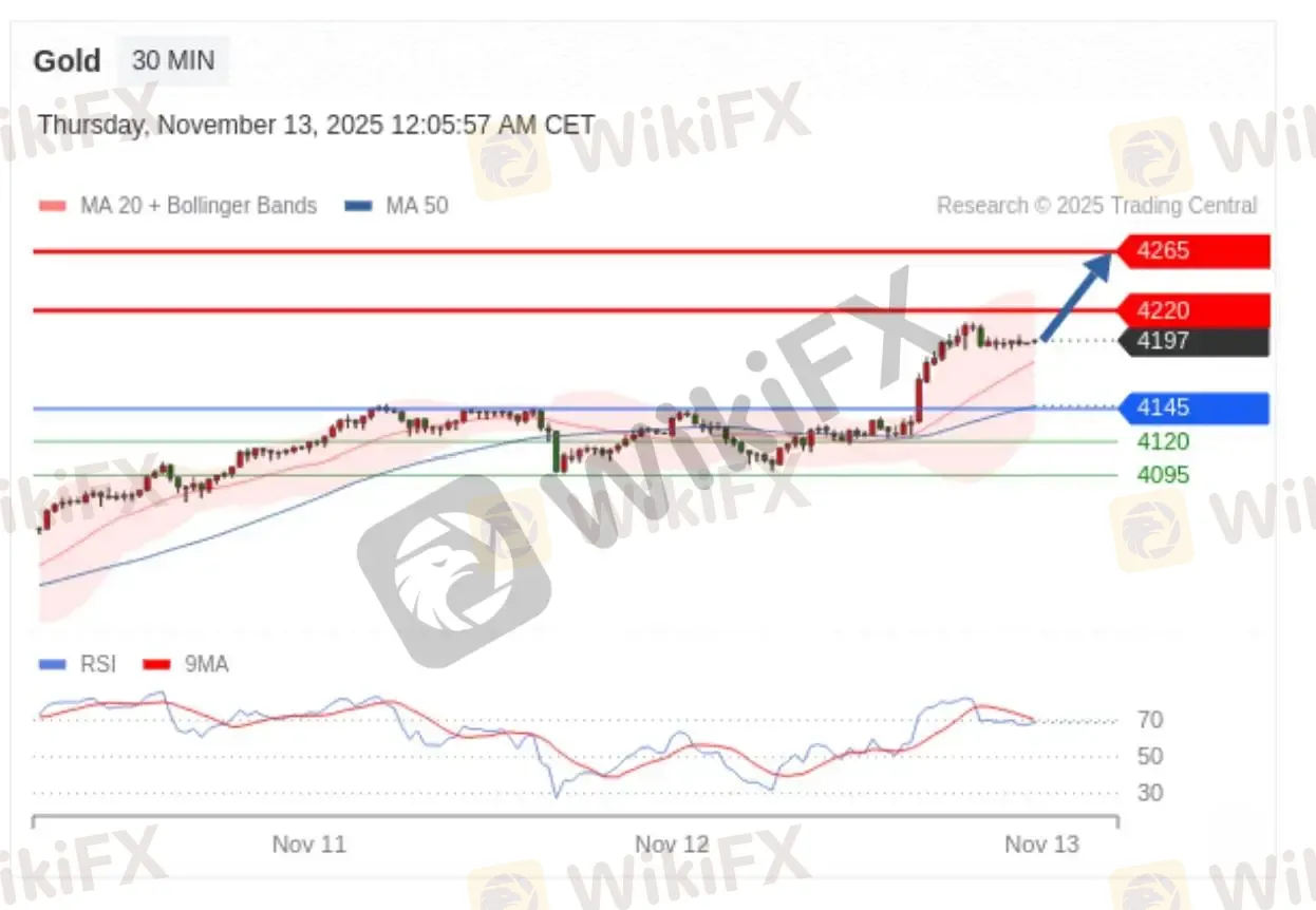 在 4145 之上,看涨,目标价位为 4220 ,然后为 4265 。