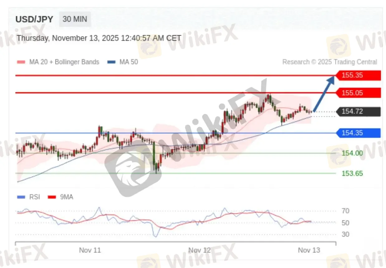 在 154.35 之上,看涨,目标价位为 155.05 ,然后为 155.35 。