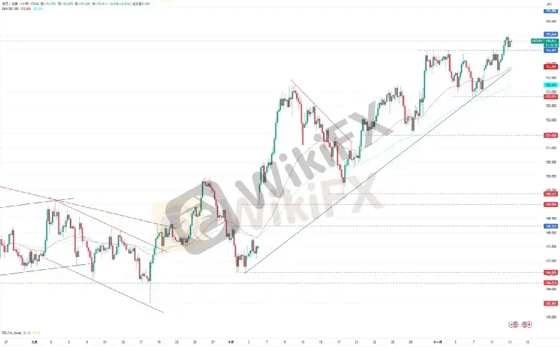 美元/日元继续保持在上涨趋势线上方进行交易,并开始测试155.00美元的阻力水平。上涨方面,美元/日元目前的阻力11月12日的高点155.044,再来是2月3日的高点155.880。下跌方面,美元/日元初步的支撑为11月1日低点153.663,再来是11月6日低点152.831。