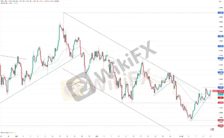 CPT Markets分析师指出,欧元/美元受下方EMA50以及上升趋势线的支撑,继续冲击1.1600的关键阻力水平。上涨方面,欧元/美元目前的阻力为11月11日的高点1.16059,再来是10月29日的高点1.16688。下跌方面,欧元/美元目前的支撑为11月10日的低点1.15411,再来是11月5日的低点1.14685。