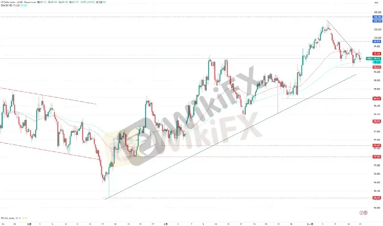 CPT Markets分析师指出,美元指数持续保持在EMA50均线的压力线下方至99.312水平支撑的区间内盘整。下跌方面,美元指数目前的支撑为11月11日的低点99.312,接着是10月28日的低点98.572。上涨方面,美元指数目前的阻力为11月7日的高点99.919,再来是11月5日的高点100.397。