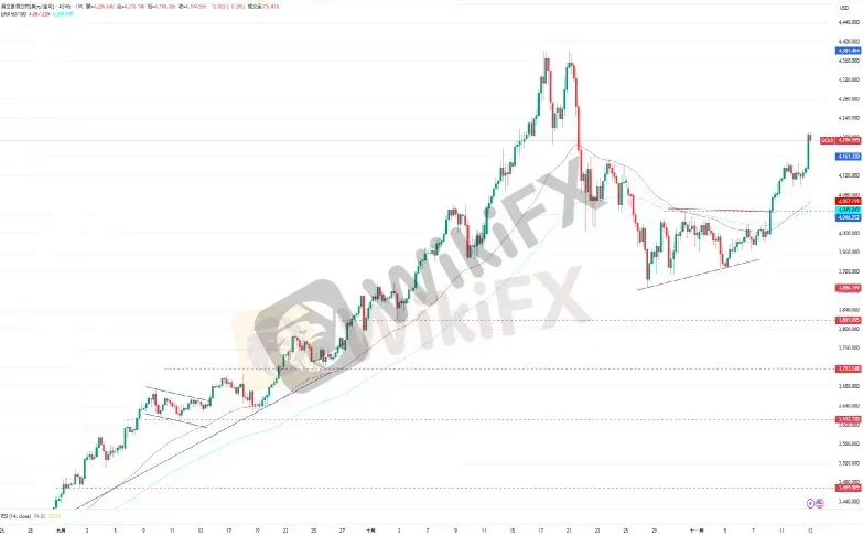 CPT Markets分析师指出,黄金价格在突破4161美元的阻力水平后进一步延续涨势,但目前由于RSI指标已来到70的超买区域上方,须注意短线回落的可能。上涨方面,黄金目前的阻力为11月12日高点4211美元,再来是4300美元水平与10月17日的高点4380美元。下跌方面,黄金目前的支撑为11月11日的低点4096美元,再来EMA50所在的4072美元。