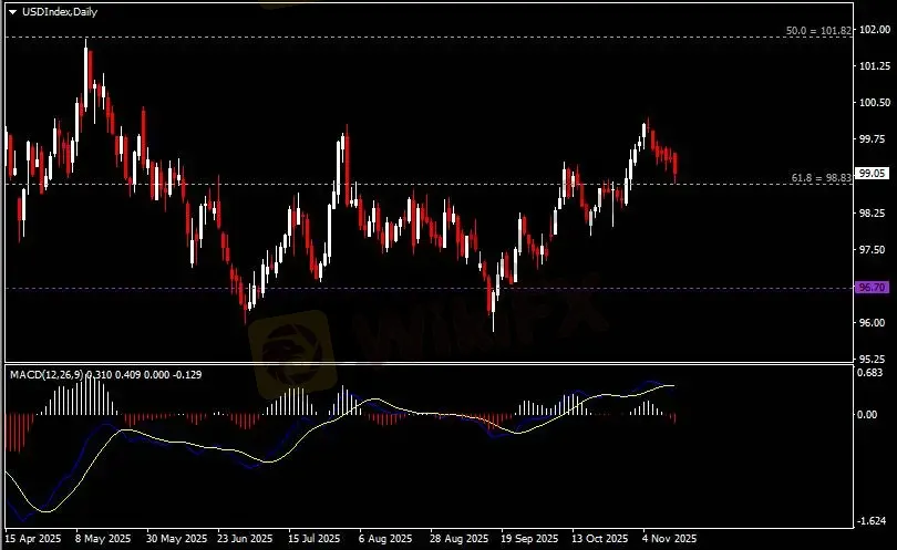 日线图显示美元指数震荡下挫,当前测试98.80支撑。从MACD来看,快慢线死叉依旧,红色动能柱温和放量。指数走势基本和动能柱的变化一致。