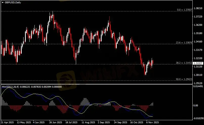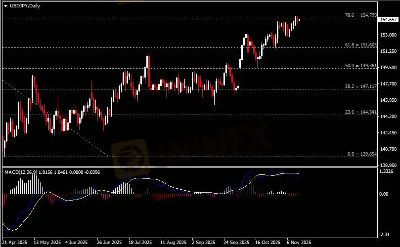 日线图显示美元兑日元涨势暂缓,当前承压于154.80阻力。从MACD来看,快慢线略拐向下行,红色动能柱则温和收缩。汇价走势和动能柱的变化呈分歧。