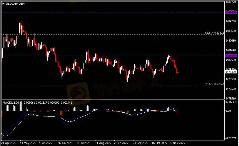 日线图显示美元兑瑞郎震荡下挫,当前承压于0.81关键阻力。从MACD来看,快慢线拐向下行,红色动能柱温和放量。汇价走势基本和动能柱的变化一致。