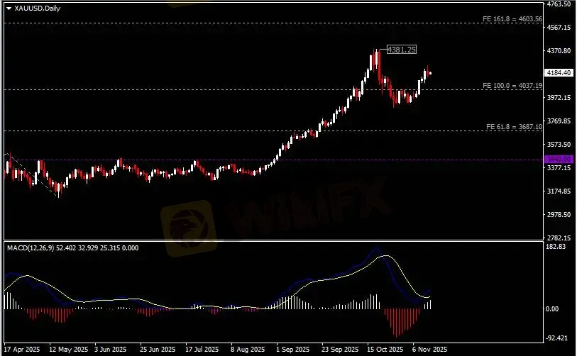 日线图显示金价小幅回落,当前仍企稳于4040支撑。从MACD来看,快慢线拐向上行,白色动能柱温和放量。金价走势和动能柱的变化呈分歧。