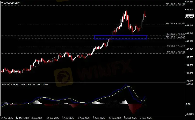 日线图显示银价回调下挫,当前仍企稳于49关键支撑。从MACD来看,快慢线向上运行,白色动能柱温和放量。银价走势和动能柱的变化呈分歧。