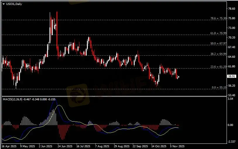 日线图显示纽元兑美元回调走弱,当前承压于0.5740阻力。从MACD来看,快慢线欲形成金叉,红色动能柱收缩殆尽。汇价走势和动能柱的变化呈分歧。