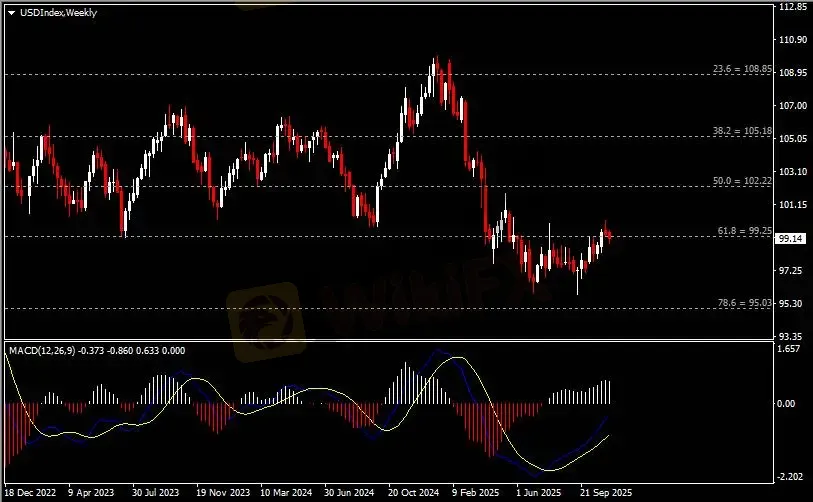 周线图显示美元指数回调走弱,当前测试99.20支撑。从MACD来看,快慢线向上运行,白色动能柱则温和收缩。指数走势基本和动能柱的变化一致。