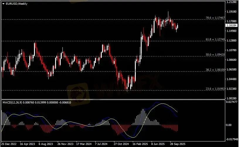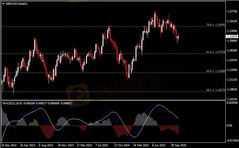 周线图显示欧元兑美元温和反弹,当前仍承压于1.1750阻力。 从MACD来看,快慢线向下运行,红色动能柱则温和收缩。汇价走势基本和动能柱的变化一致。