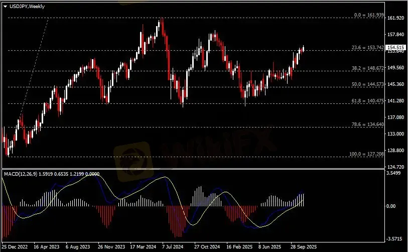 周线图显示美元兑日元震荡上行,当前收于前高153.70。从MACD来看,快慢线向上运行,白色动能柱温和放量。汇价走势基本和动能柱的变化一致。