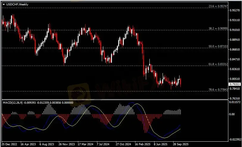 周线图显示美元兑瑞郎震荡下挫,当前收于0.7780支撑。 从MACD来看,快慢线向上运行,白色动能柱则温和收缩。汇价走势基本和动能柱的变化一致。
