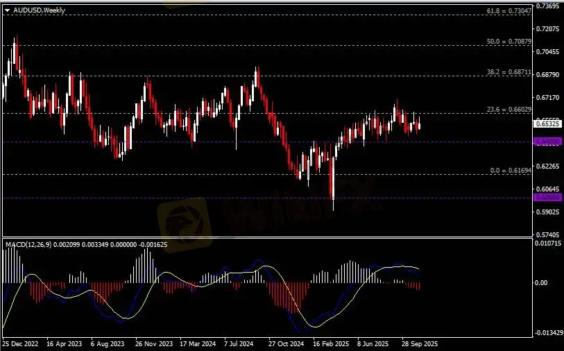 周线图显示澳元兑美元于区间窄幅震荡,当前承压于0.66关键阻力。 从MACD来看,快慢线向下运行,红色动能柱则温和收缩。汇价走势基本和动能柱的变化一致。