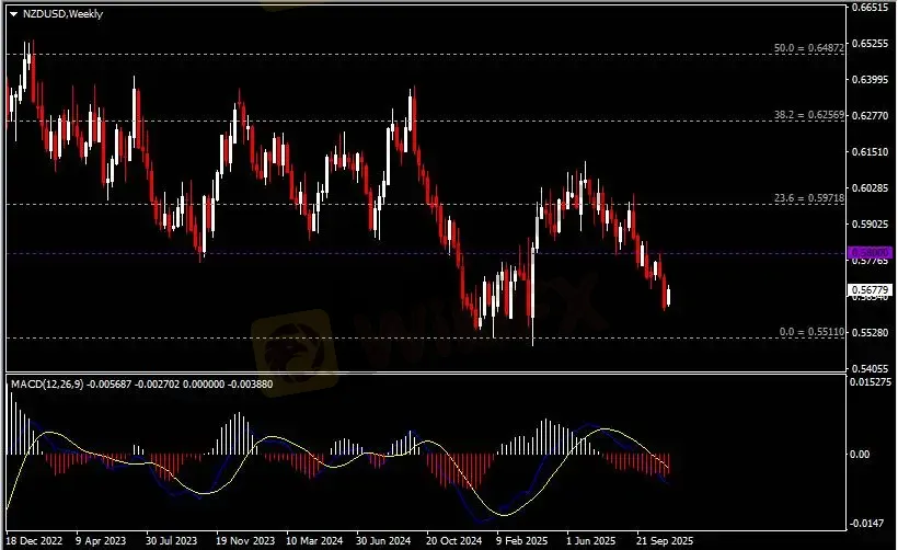 周线图显示纽元兑美元反弹上涨,当前仍承压于0.58关键阻力。从MACD来看,快慢线向下运行,红色动能柱温和收缩。汇价走势基本和动能柱的变化一致。