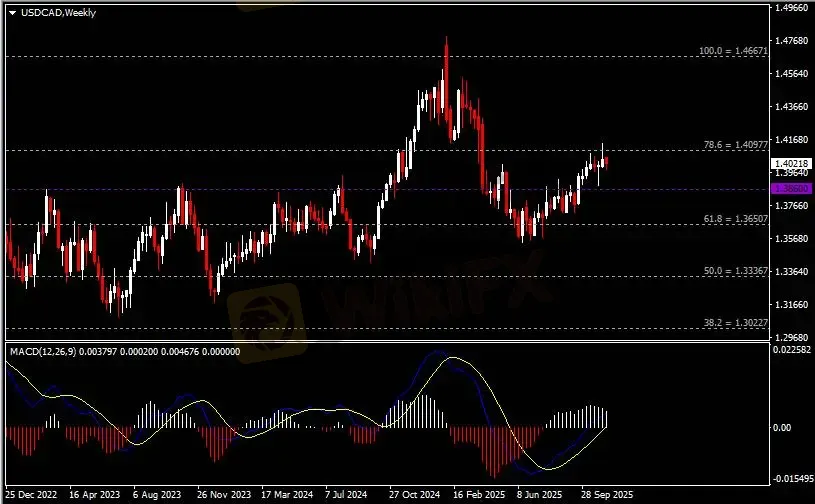 周线图显示美元兑加元回调下挫,当前承压于1.41关键阻力。从MACD来看,快慢线向上运行,白色动能柱则温和收缩。汇价走势基本和动能柱的变化一致。