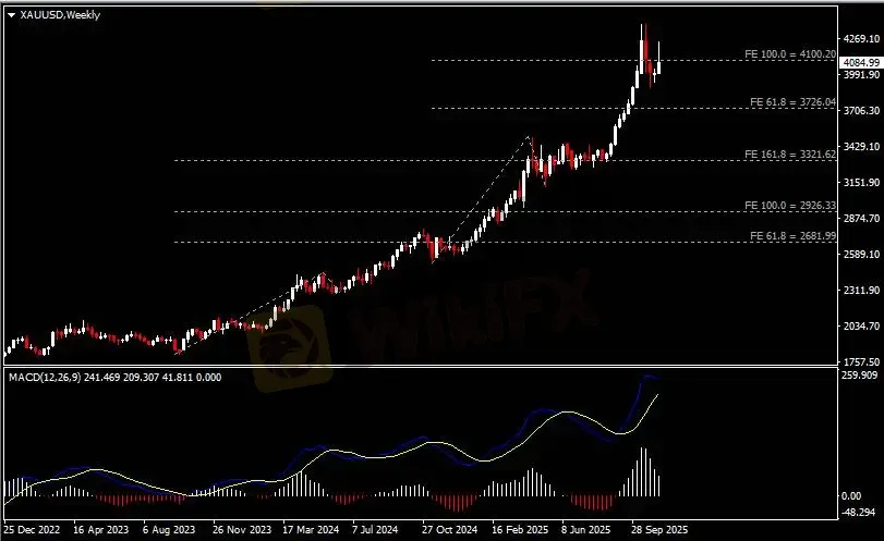 周线图显示金价震荡上行,当前测试4100关键阻力。从MACD来看,快慢线呈拐向,白色动能柱温和收缩。金价走势和动能柱的变化呈分歧。
