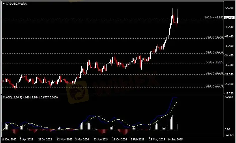 周线图显示银价震荡上行,当前收于前高49.90。从MACD来看,快慢线呈拐向,白色动能柱温和收缩。银价走势和动能柱的变化呈分歧。