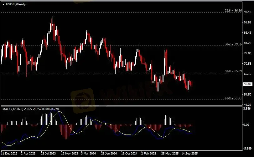 周线图显示油价回调下挫,当前承压于65.70阻力。从MACD来看,快慢线呈拐向,红色动能柱温和收缩。油价走势和动能柱的变化呈分歧。
